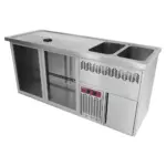 Bar toonbank met 2 compartimenten, afdruiprek + rooster, 2 spoelbakken rechts.