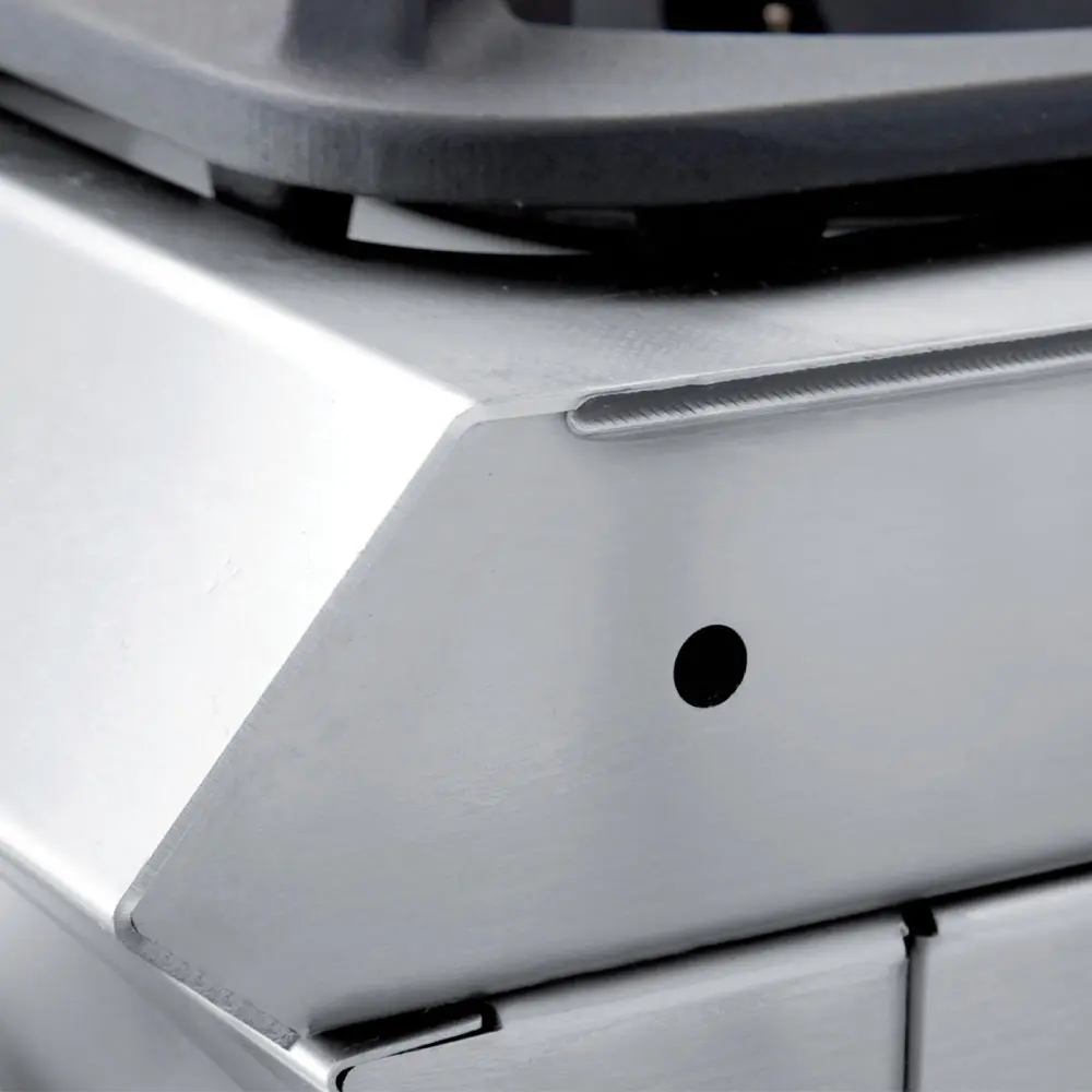 - Gietijzeren braadplaat (15mm) met hoog warmtegeleidingsvermogen, schuin naar voren en uitgerust met een anti-spatrand op 3 gelaste zijden (3mm) in roestvrij staal, perfecte afdichting. Frontale opvanglade voor recuperatie van het braadvocht.