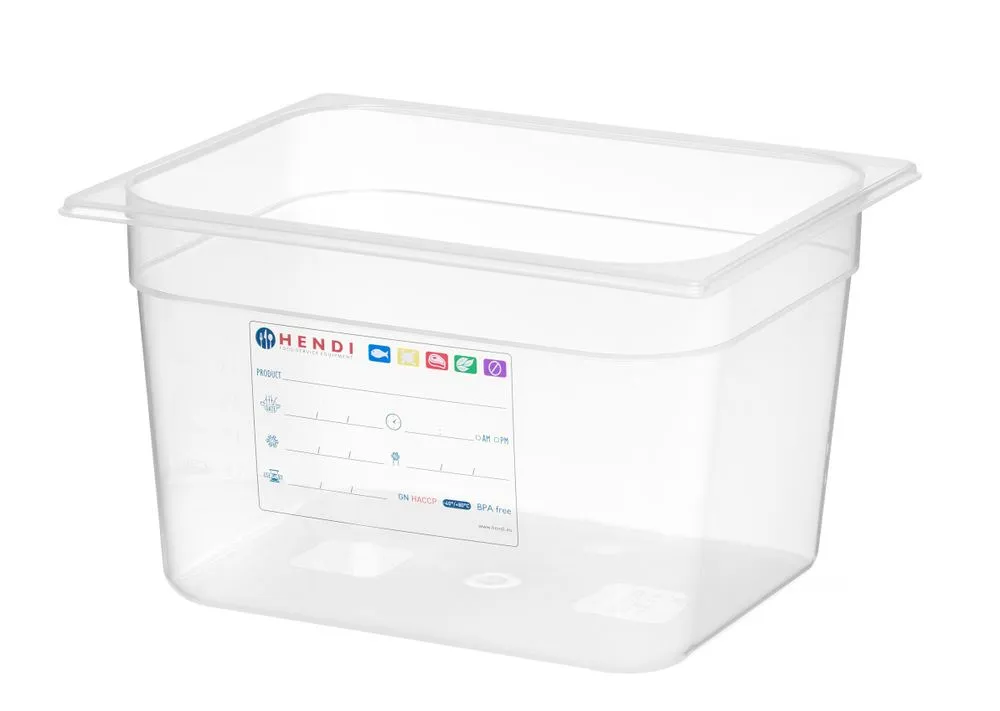 Bullet Points:Geïntegreerd HACCP etiket.Beschrijfbaar met uitwisbare stiften.Absorbeert geen geuren of smaken.Geschikt voor vaatwasmachines.Stapelbaar.