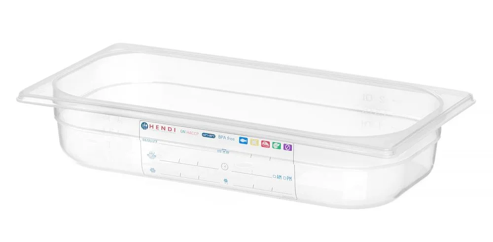 Bullet Points:Geïntegreerd HACCP etiket.Beschrijfbaar met uitwisbare stiften.Absorbeert geen geuren of smaken.Geschikt voor vaatwasmachines.Stapelbaar.