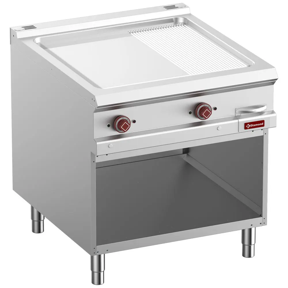 - Bakplaat in gietijzer (15 mm) met hoge warmtegeleiding, schuin naar voren en voorzien van een spatwaterdichte rand aan 3 zijden gelast (3mm) in roestvrij staal, perfecte afdichting. Opvanglade voor recuperatie van het kookvocht aan de voorkant van het apparaat.