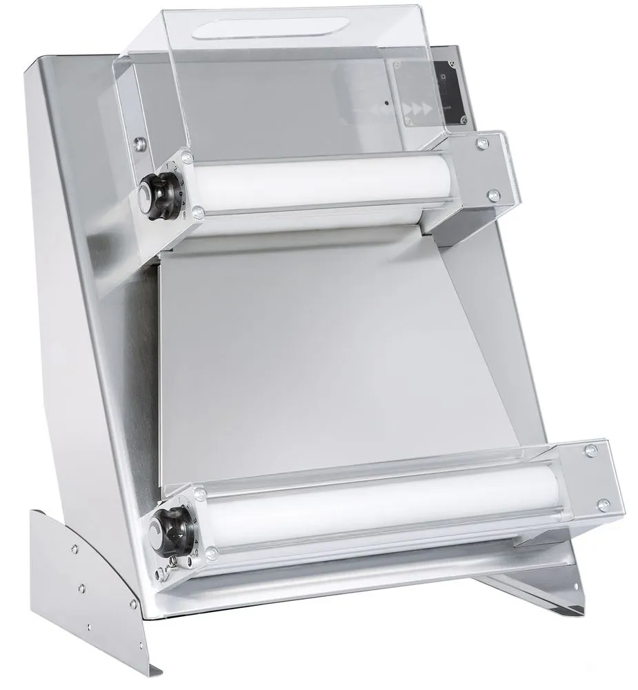 De Prismafood “Touch and go” elektrische deegroller 400 heeft een automatische startfunctie die wordt geactiveerd zodra het deeg wordt aangebracht, waardoor waardevolle tijd wordt bespaard in drukke keukens. Hij is gemaakt van duurzaam roestvrij staal en heeft verstelbare dubbele rollersets voor precieze dikte en afronding, zonder het deeg te verwarmen.