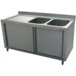 Spoeltafel 2 kuipen 500x500xh325, links druipvlak op kast met 2 schuifdeuren