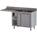 Spoeltafel met 2 kuipen 400×500×300, afdruipblad links, op kast met 2 schuifdeuren en ruimte voor vaatwasser
