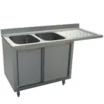 Spoeltafel met 2 kuipen 500x500x325 rechts druipvlak op kast met 2 schuifdeuren en nis voor vaatwasser