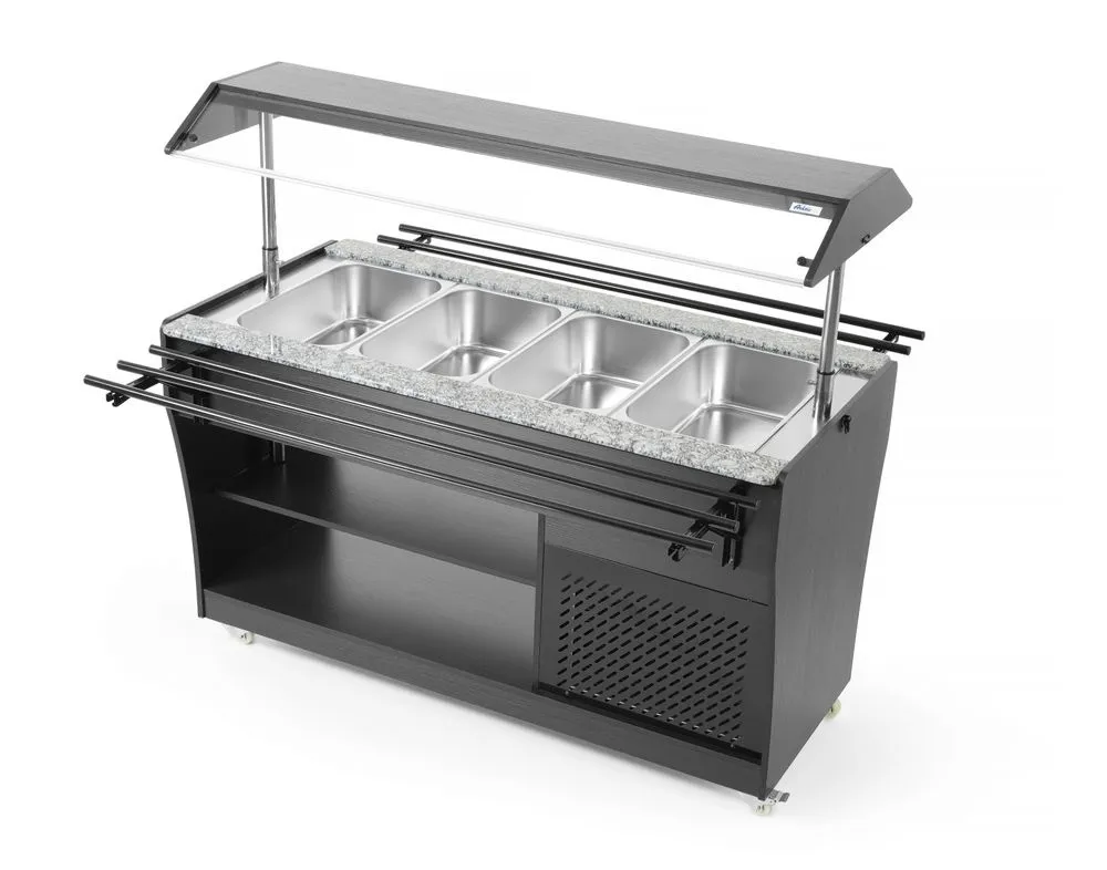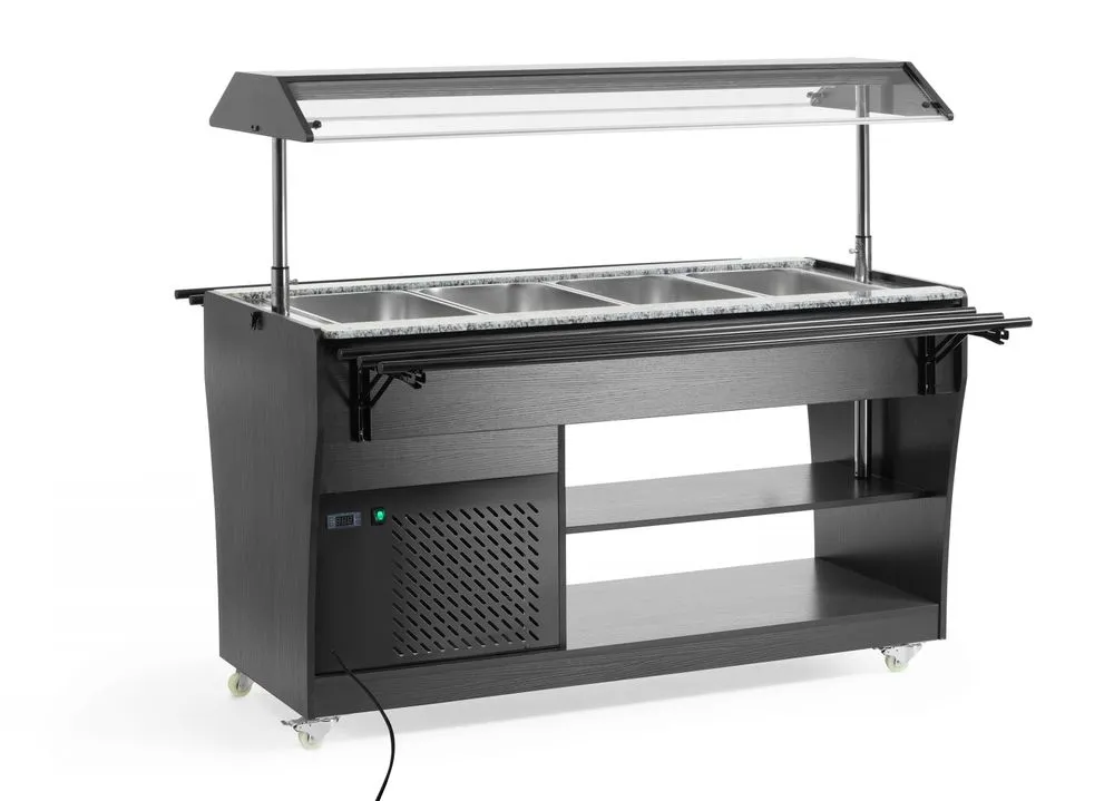 Behuizing gemaakt van roestvast staal met zwart multiplex. Geschikt voor 4 GN 1/1 containers – max. 150 mm diep. Geleverd met 4 GN 1/1 containers. Uitgerust met een lampje in de kap. De luifel kan worden neergelaten om als afdekking te fungeren, vastgezet met vergrendelingen. Inklapbare dienblad geleiders aan beide zijden. Grote plank onder de toonbank. Uitgerust met 4 zwenkwielen. Temperatuur instelbaar van 2°C tot 10°C. Klimaatklasse: 4. Bullet Points:Stijlvol ontwerp – roestvrij staal en zwart multiplexMet ingebouwd licht in de luifelPlank biedt extra opslagruimte onder de balieDe luifel fungeert als afdekking om de inhoud van het buffet te beschermen4 GN 1/1-containers inbegrepen